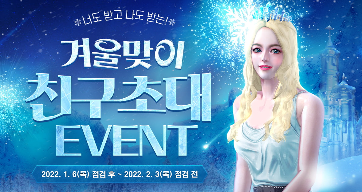 친구를 초대하고 미션을 수행해 아이템 보상을 받는 겨울 맞이 친구 이벤트와