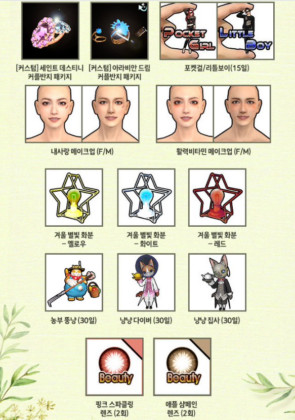 포켓걸/리틀보이 (15일), 내사랑 메이크업(F/M), 활력비타민 메이크업(F/M)