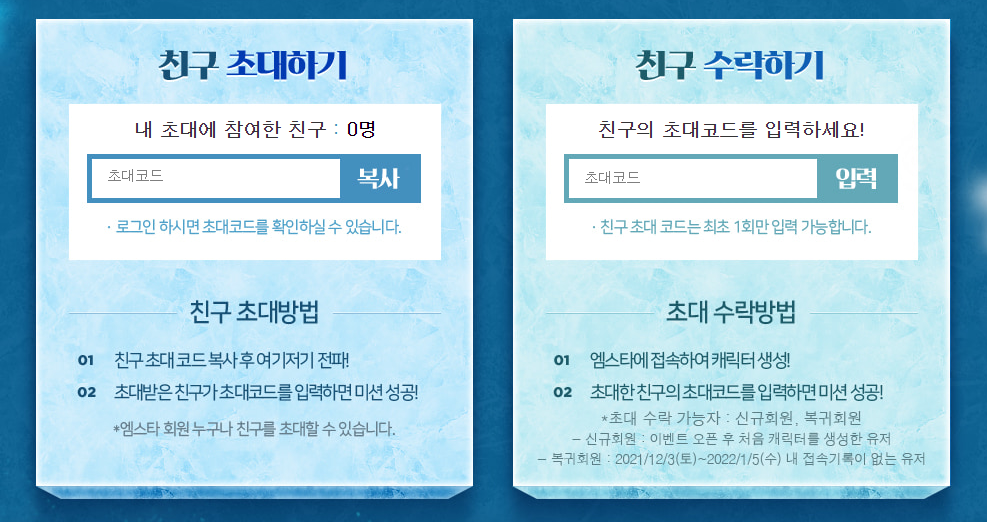 * 친구 코드가 없는 신규/복귀 유저도 2, 3, 4 미션을 완료하면 보상을 획득할 수 있습니다.