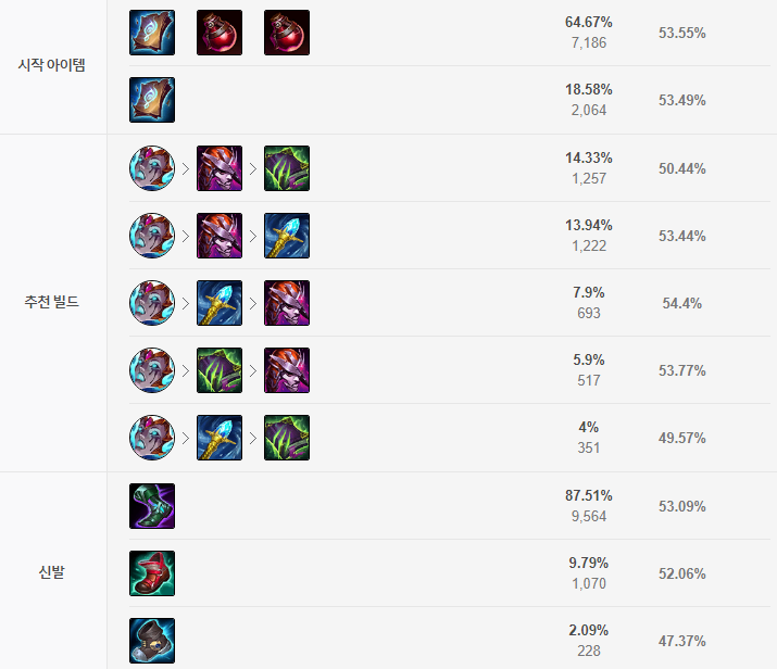 대상이 죽으면 마나를 회복하기 때문에 미니언을 차례차례 전염시켜 처리하면 마나를 쉽게 관리하면서 라인을 클리어 할 수 있습니다. W스킬은 한타 구도에서 효율이 별로 좋지 않기 때문에 한타가 자주 일어나는 칼바람에서 제일 마지막에 스킬 레벨을 올리지만 상대가 그랩 챔피언이 많다면 초반에 찍는 것도 나쁘진 않습니다.