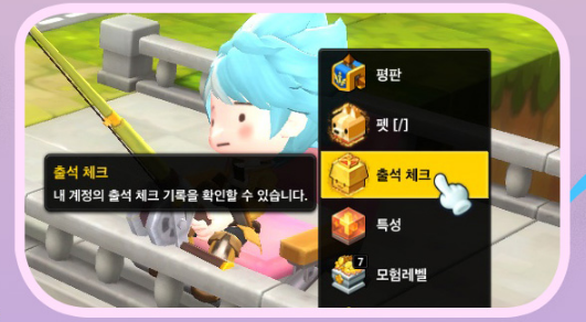 캐릭터 > 출석 체크 메뉴에서 출석 체크 기록과 보상 확인이 가능합니다.