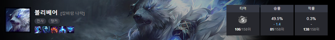 칼바람 볼리베어는 158개 챔피언 중 106위이고 현재 5티어에 자리잡고 있습니다.