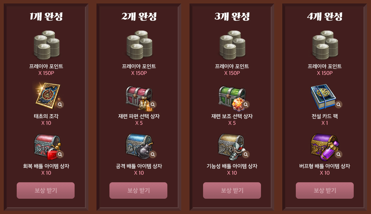 4개 완성 시 : 프레이야 포인트 150p, 전설 카드 팩 1개, 버프형 배틀 아이템 상자 10개