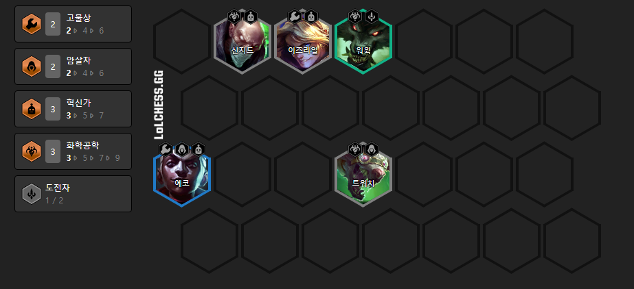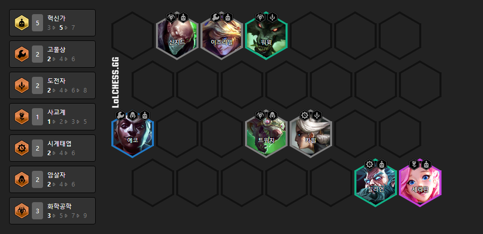 5혁신가, 2고물상, 2도전자, 2시계태엽, 2암살자, 3화학공학 시너지를 받으시면 됩니다.