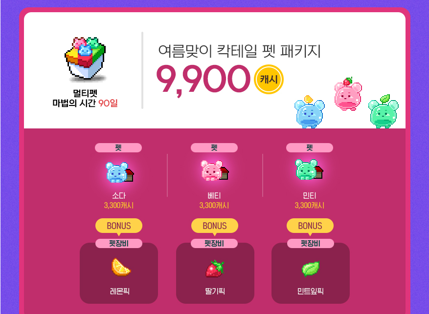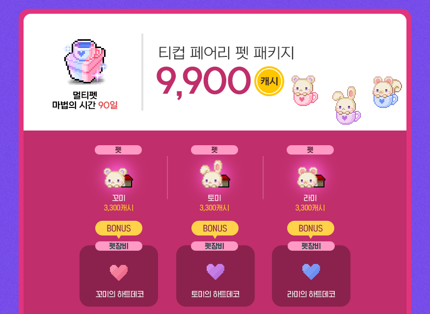 9900원으로 귀여운 멀티펫 3마리와 3개의 펫장비까지 획득할 수 있는 진짜 갓갓갓성비 펫 패키지입니다.
