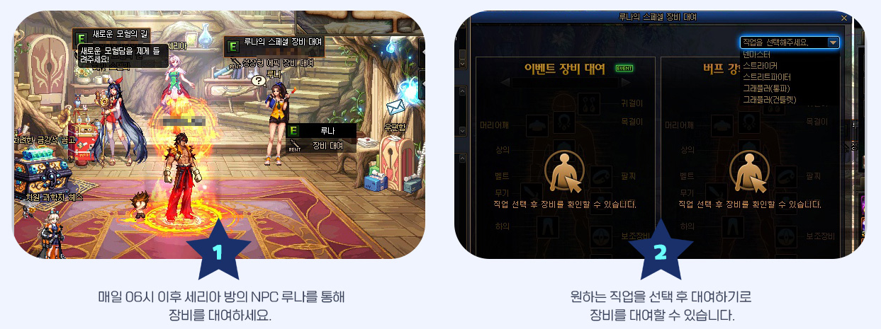 1. 매일 06시 이후 세리아 방에 위치한 NPC 루나를 통해 장비를 대여할 수 있습니다.