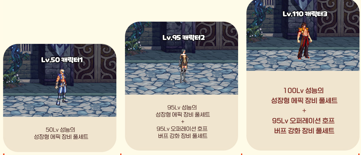 95레벨 캐릭터 : 95레벨 성능의 성장형 에픽 장비 풀세트 + 95레벨 오퍼레이션 호프 버프 강화 장비 풀세트