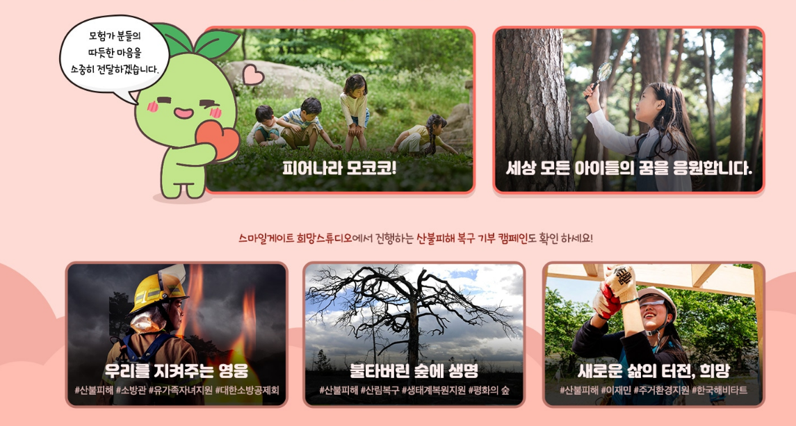 산불피해 복구 기부 캠페인도 진행된다고하니 자세한 내용은 스마일게이드 희망스튜디오에서 확인해보시길 바랍니다.