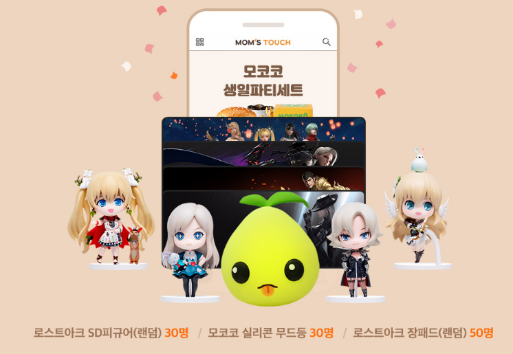 2022년 4월 16일(토) ~ 2022년 5월 15일(일) 23시 59분 기간 동안 맘스터치 주문 앱을 통해 모코코 생일파티 세트를 주문하면 추첨을 통해 로스트아크 굿즈를 받을 수 있다고합니다.