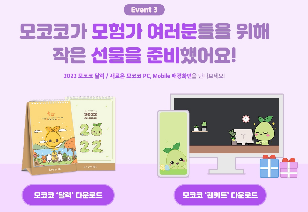 감사의 선물은 헤드셋&마우스 세트, 마우스&번지 세트, NEW 토토이끼 쿠션, 모코코 텀블러, 모코코 장패드, 모코코 2022 캘린더, 로스트아크 장패드입니다.