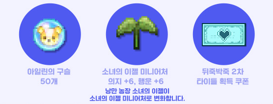 아일린을 완전히 성장 시키면 다음날 아일린의 구슬 50개, 소녀의 이젤 미니어처, 뒤죽박죽 2차 타이틀 획득 쿠폰을 획득합니다.
