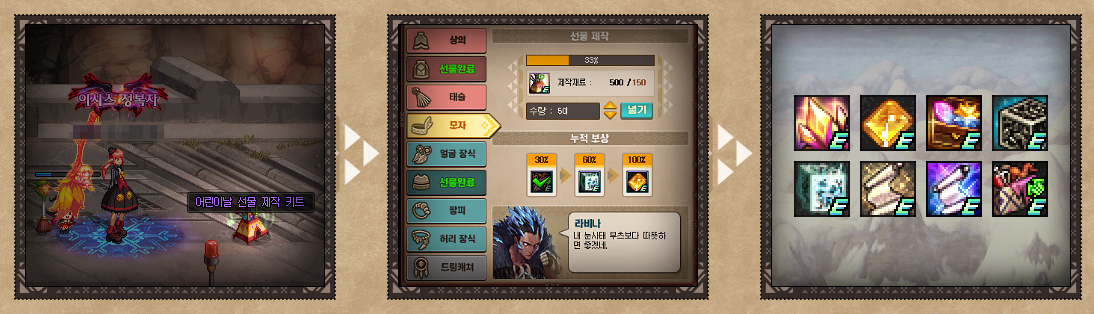 * 선물의 완성도 30%, 60%, 100% 에 따라 다른 보상을 획득합니다.