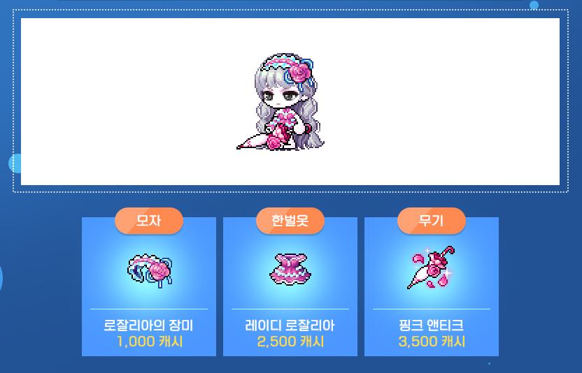 모자 : 로잘리아의 장미 / 한벌옷 : 레이디 로잘리아 / 무기 : 핑크 앤티크