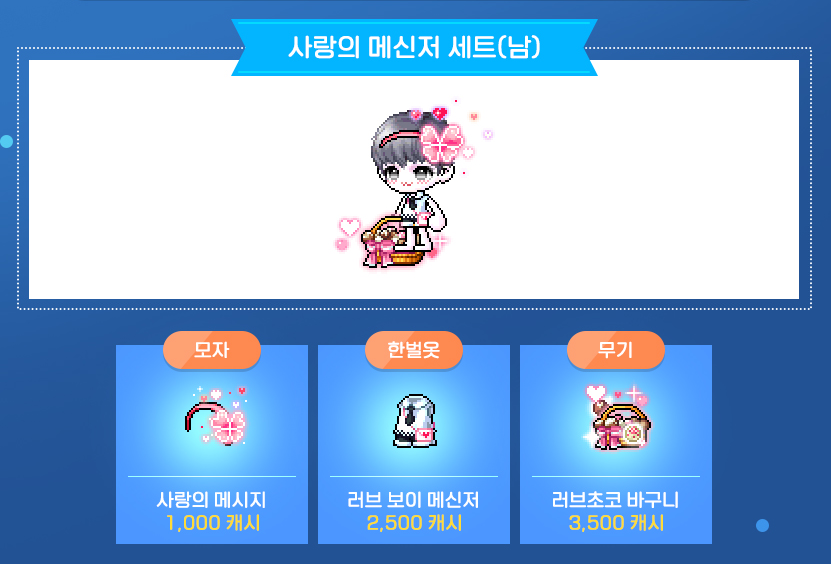 모자 : 사랑의 메시지 / 한벌옷 : 러브 보이 메신저 / 무기 : 러브초코 바구니