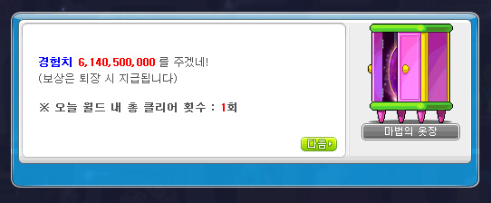 퇴장 맵에 위치한 NPC 마법의 옷장 클릭 시 캐릭터 레벨에 따른 경험치 보상을 획득합니다.