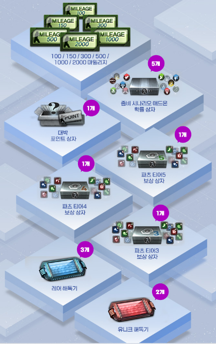 100/150/300/500/1000/2000 마일리지, 좀비 시나리오 애드온 확률 상자 5개, 대박 포인트 상자 1개