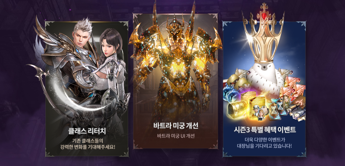 시즌3의 주요 컨텐츠는 기존의 클래스들의 리터치와 바트라 미궁 개선, 시즌3 특별 혜택 이벤트라고합니다.