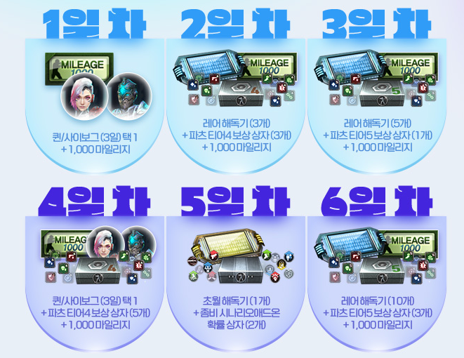 1일차 보상 : 퀸/사이보그(3일) 택 1 + 1000마일리지