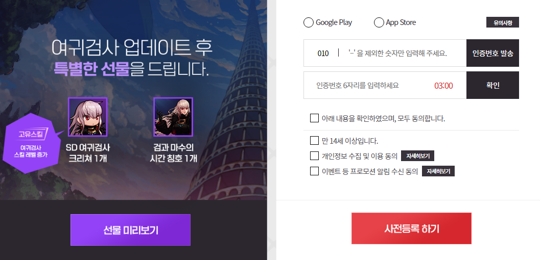 스토어 선택 후 휴대폰 번호를 입력 및 유의사항 확인 후 동의 여부에 체크한 뒤 사전등록 하기 버튼을 누르면 사전등록이 완료됩니다.