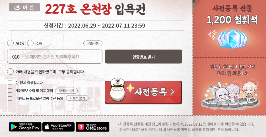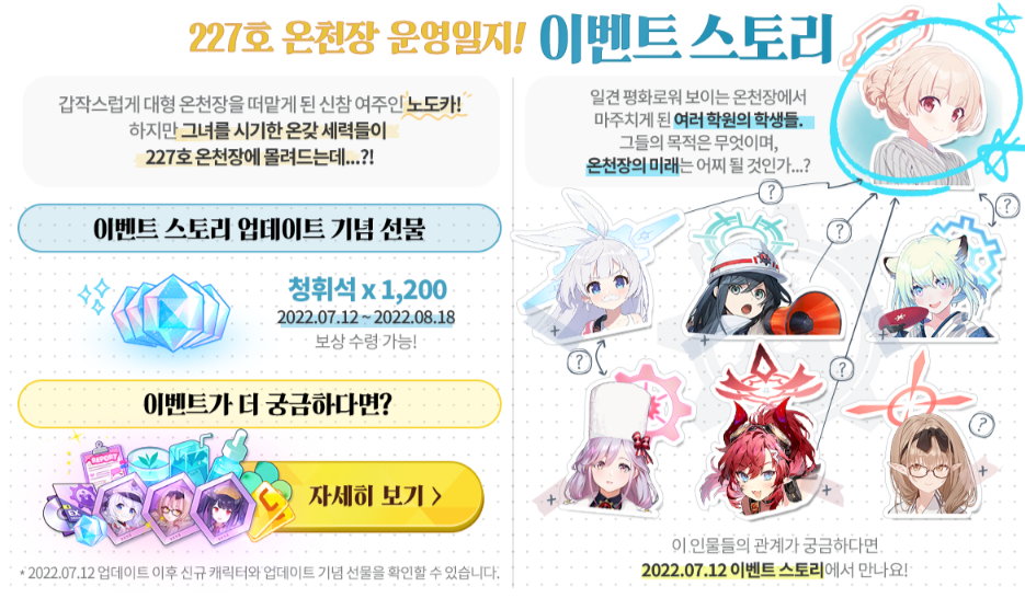 7월 12일(화) 업데이트 예정인 이벤트 스토리 227호 온천장 운영일지!에 앞서 사전등록 이벤트가 진행됩니다.