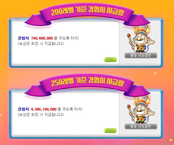 퇴장맵에 위치한 NPC 불꽃 슈피겔만에게 말을 걸면 캐릭터 레벨에 따른 경험치 보상을 획득할 수 있습니다.