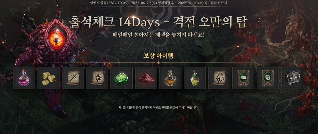 * 출석체크 14 Days - 격전 오만의 탑 이벤트는 계정 당 1회 참여할 수 있으며 모든 보상은 인벤토리로 즉시 지급됩니다.