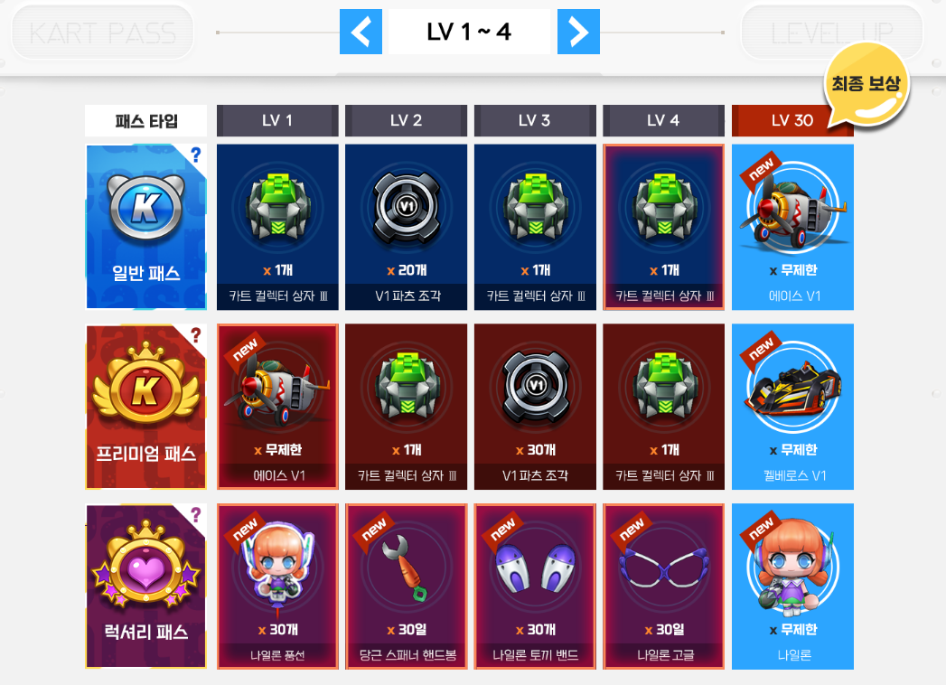 | 일반 패스 | 카트 컬렉터 상자Ⅲ 1개 | V1 파츠 조각 20개 | 카트 컬렉터 상자Ⅲ 1개 | 카트 컬렉터 상자Ⅲ 1개 |