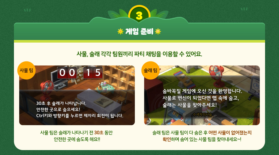 사물 / 술래 팀은 각각 팀원 끼리 파티 채팅을 이용할 수 잇습니다.