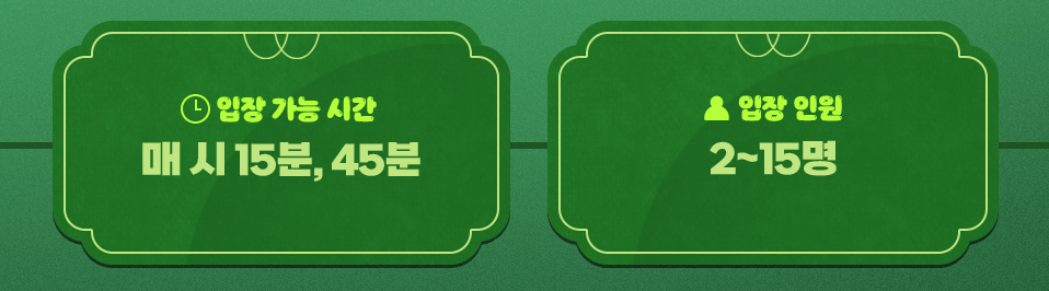입장 가능 시간은 매 시 15분, 45분입니다.
