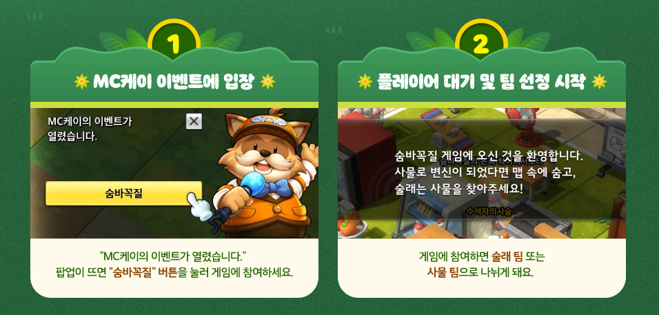 'MC케이의 이벤트가 열렸습니다.' 팝업이 뜨면 숨바꼭질 버튼을 클릭하여 게임에 참가할 수 있습니다.