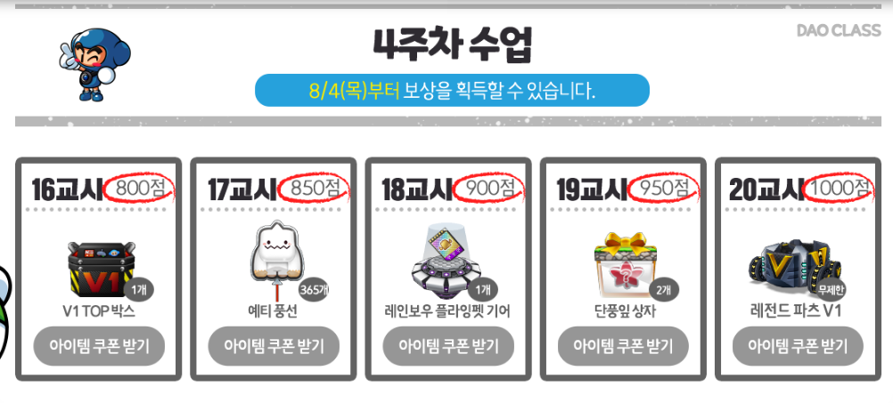 획득한 점수에 따라 받을 수 있는 보상은