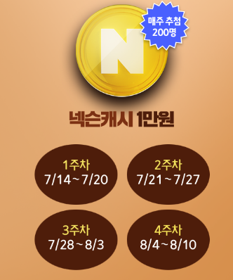 매 주 출석 체크를 한 유저들 중 200명을 추첨해 넥슨캐시 1만원을 드린다고합니다.