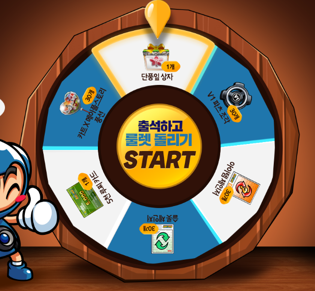 매일 1일 1회 출석 체크 룰렛을 돌릴 수 있습니다.