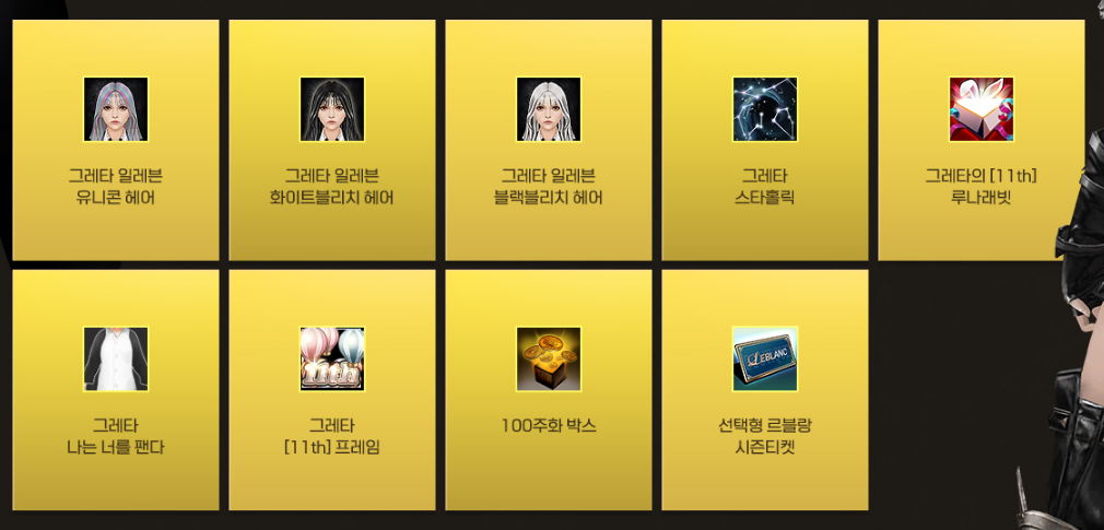 그레타 일레븐 유니콘 헤어, 그레타 일레븐 화이트블리치 헤어, 그레타 일레븐 블랙블리치 헤어, 그레타 스타홀릭, 그레타의 [11th] 루나래빗, 그레타 나는 너를 팬다, 그레타[11th] 프레임, 100주화 박스, 선택형 르블랑 시즌티켓입니다.