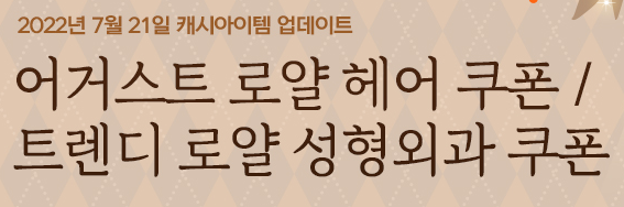 7월 21일(목) 오늘 캐시아이템 업데이트 후 어거스트 로얄 헤어 쿠폰과 트렌디 로얄 성형외과 쿠폰이 업데이트 됐습니다.