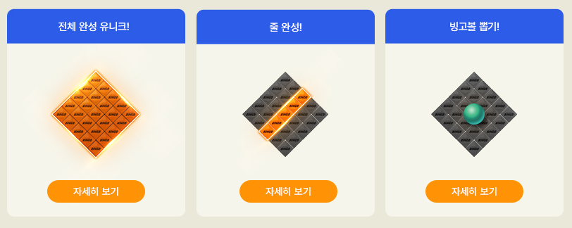 빙고볼 뽑기, 줄 완성, 전체 완성 시 빙고 보상을 획득합니다.