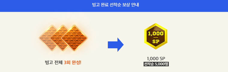 *빙고 전체 완료 유니크 보상을 3회 획득 완료하면 선착순으로 5000명에게 1000SP를 지급한다고합니다.