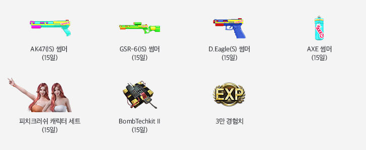 AK47(IS) 썸머 (15일), GSR-6(IS) 썸머 (15일), D.Eagle(S) 썸머(15일), AXE 썸머 (15일)