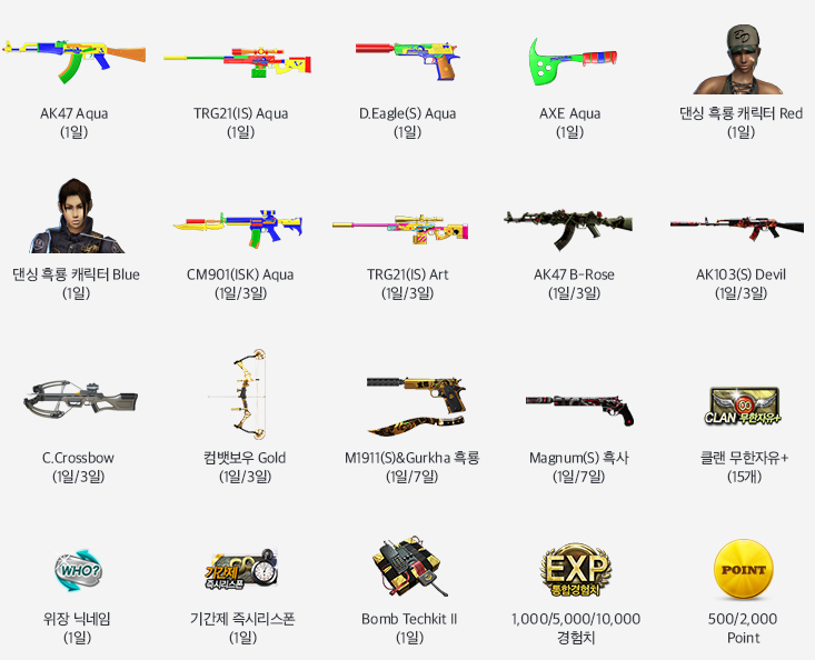 AK 47 Aqua(1일), TRG21(IS) Aqua(1일), D.Eale(S) Aqua(1일), AXE Aqua(1일), 댄싱 흑룡 캐릭터 Red (1일)