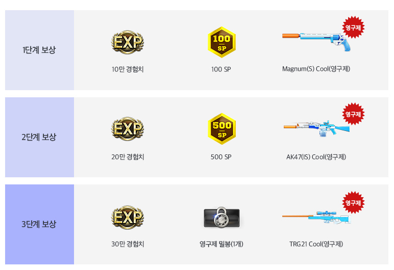 3단계 보상 : 30만 경험치, 영구제 밀봉(1개), TRG21 Cool(영구제)