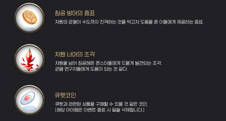 | 자발적 기부 퀘스트 | 아이작 | 60 | 침공방어의 증표 1개, 큐펫 코인 2개, 공훈점수 5점 |