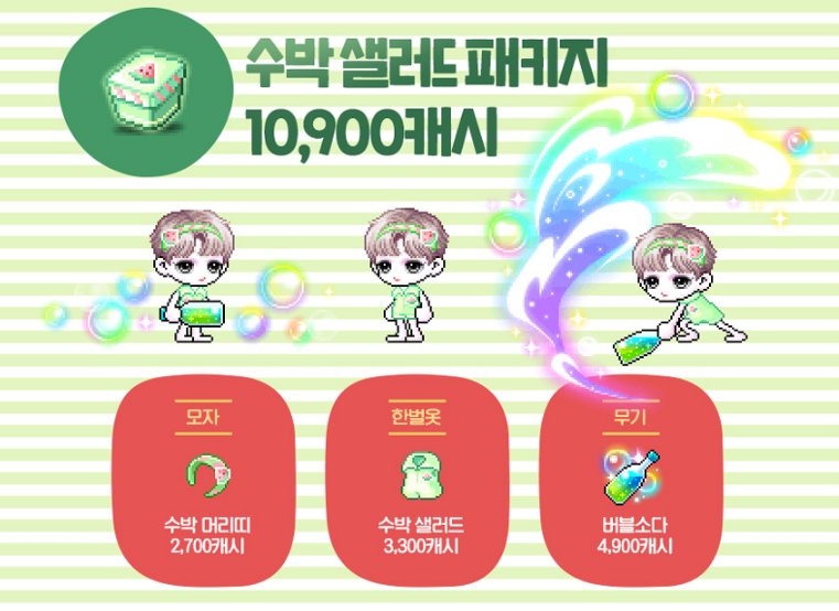 모자 : 수박 머리띠 / 한벌옷 : 수박 샐러드 / 무기 : 버블 소다