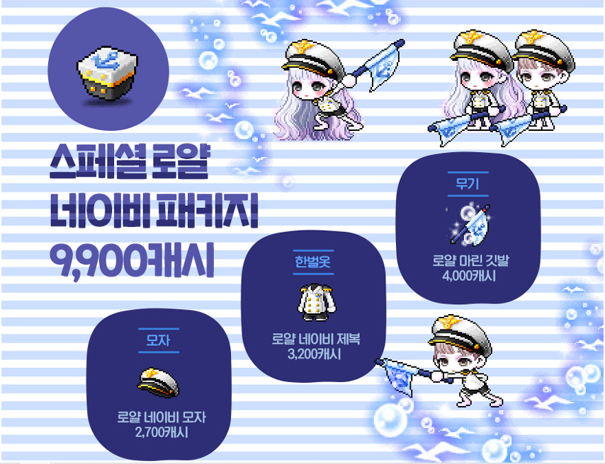 모자 : 로얄 네이비 모자 / 한벌옷 : 로얄 네이비 제복 / 무기 : 로얄 마린 깃발