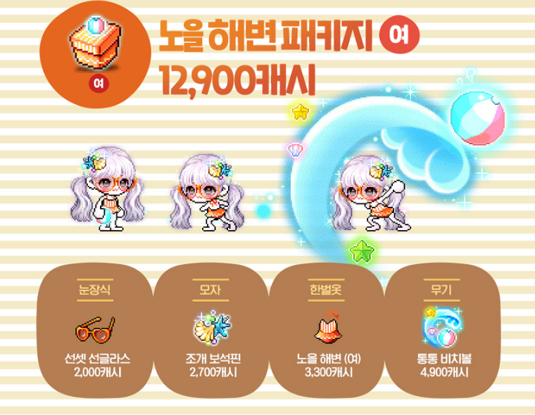 눈장식 : 해변(선셋) 선글라스 / 모자 : 해변 페도라, 조개 보석핀 / 한벌옷 : 흰모래 해변, 노을 해변 / 무기 : 통통 비치볼