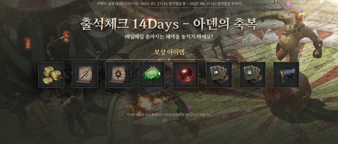 이벤트 기간 매일 출석 보상으로 아덴의 축복 상자 1개를 획득합니다.