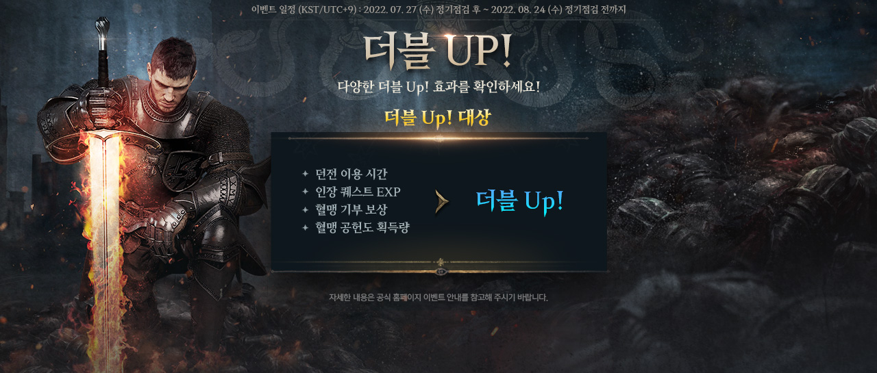 더블 Up! 이벤트 기간 동안 던전 이용시간, 퀘스트 보상 등 다양한 콘텐츠에서 2배의 효과를 누릴 수 있는 이벤트입니다.