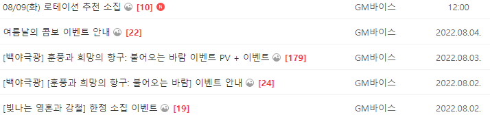 이곳에서 8월 현재 진행중인 이벤트에 대해 상세히 알 수 있습니다. 오늘 올라온 따끈따끈한 이벤트인 로테이션 추천 소집 이벤트에 대해선 아까 말씀 드렸구요.