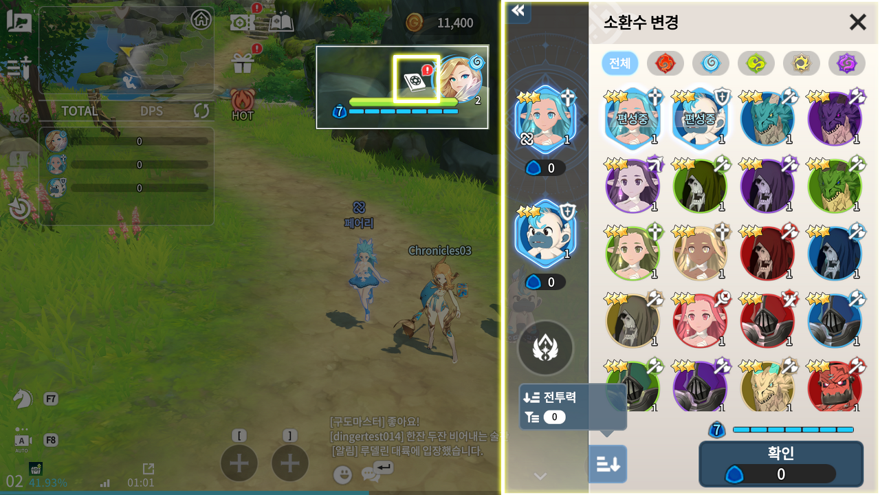 소환수 변경 메뉴를 통해 소환수를 변경할 수 있습니다.