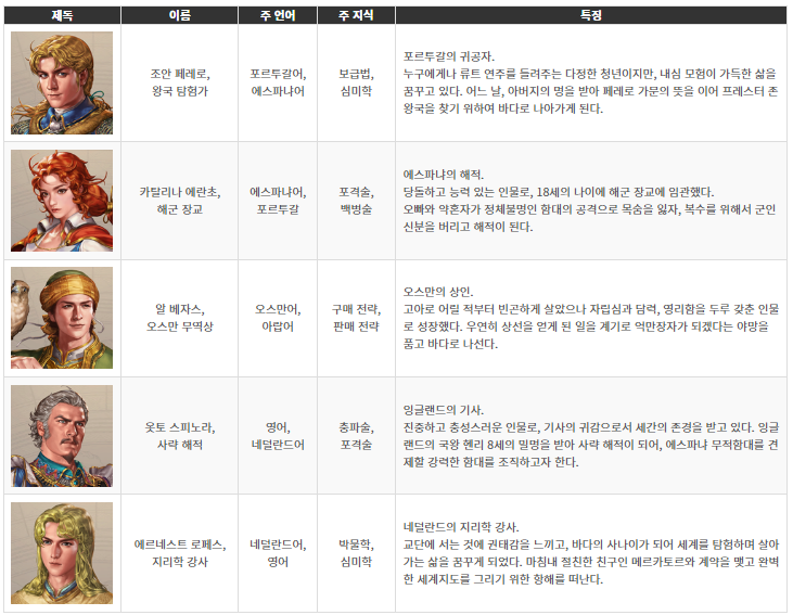 플레이어가 선택할 수 있는 제독들은 바로 이 거대한 모험의 시대를 살아가는 인물들이며 이들은 각종 명성을 인정 받아 국가로부터 작위를 수여받을 수 있습니다.