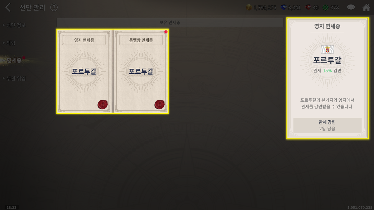 일반적으로 자국 내에서는 관세 감면 혜택을 받을 수 있으므로 타국, 그것도 앞으로 자신의 주로 이용할 도시 및 교역품을 점유하고 있는 국가의 면세증을 발급받는 것이 좋습니다. 이 중에서도 발급하고자 하는 국가의 본거지와 영지에서 통용되는 영지 면세증과 발급하고자 하는 국가의 동맹항에서 통용되는 동맹항 면세증을 선택할 수 있습니다.